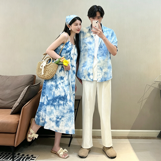💕カップルコーデ【ワンピース】夏新作 リゾート風 タイダイ染め ペアルック ワンピース&シャツ ビーチ ノースリーブ 個性デザイン ペアルック【SHシリーズ】