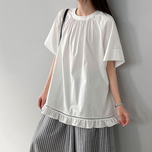 【トップス】韓国風 スモック風 ブラウス レディース 2026夏 ダーツデザイン レースフリル 透かし 通勤トップス ゆったり【JZシリーズ】