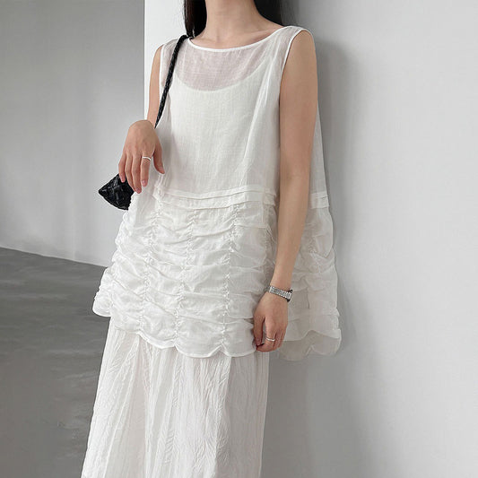 復古花卉壓褶無袖長洋裝|寬鬆直筒顯瘦連身裙女|夏季氣質日常穿搭【SH系列】