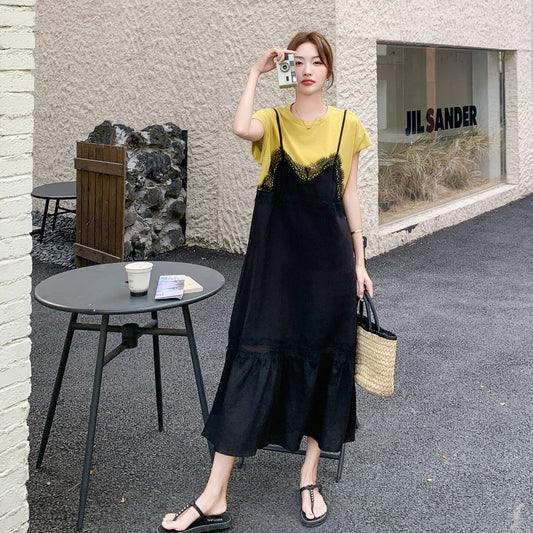 蕾絲拼接連身裙|假兩件層次感長裙女|顯瘦設計韓系氣質穿搭【JZ系列】