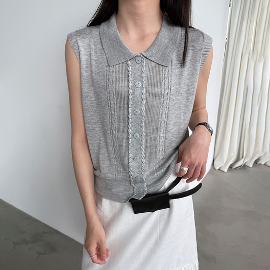 【トップス】フレンチエレガント ニットベスト レディース 2026夏 ポロカラー 透かし編み ノースリーブ ゆったりカーディガン【JZシリーズ】