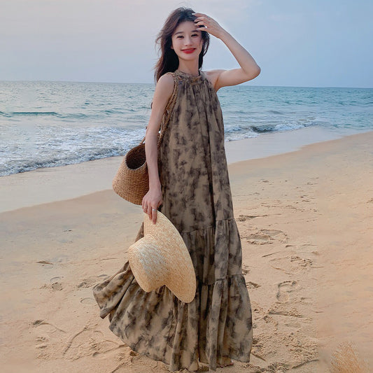 水墨印花掛脖連身裙|無袖長裙女|度假風氣質飄逸穿搭 夏日顯瘦款【SH系列】