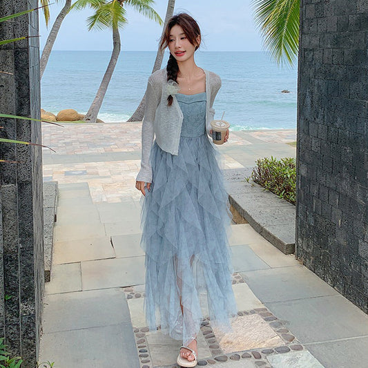 網紗吊帶連身裙+開衫套裝|兩件套女|分層蛋糕裙設計 溫柔度假風穿搭【SH系列】