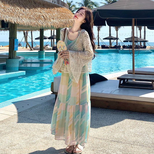 多巴胺配色吊帶連身裙+鏤空針織開衫套裝|波西米亞風兩件套女|度假風長裙穿搭【SH系列】