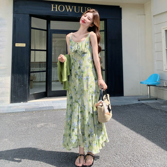 森系碎花吊帶洋裝+雪紡外套套裝|清新顯瘦兩件套女|夏日防曬度假穿搭【SH系列】