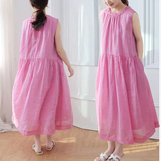 條紋亞麻感無袖連身裙|寬鬆顯瘦魚尾長裙女|氣質休閒日系穿搭【JZ系列】
