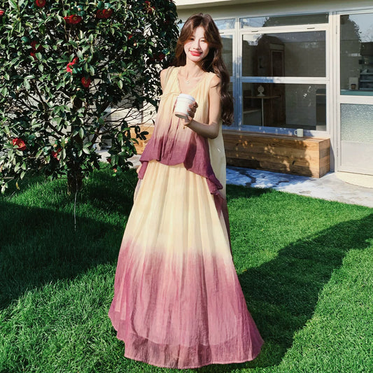 假兩件漸層吊帶長洋裝|飄逸顯瘦大裙擺連身裙女|優雅度假風穿搭【SH系列】