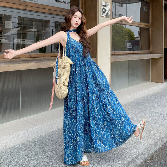 波西米亞藍印花吊帶長洋裝|寬鬆顯瘦海島度假長裙女|夏日清新氛圍穿搭【SH系列】