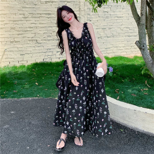 花柄吊帶連身裙|黑色A字長裙女|顯瘦無袖度假風穿搭 夏日氣質款【SH系列】