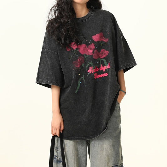 [上衣] 夏季寬鬆復古玫瑰印花短袖T卹【FC系列】