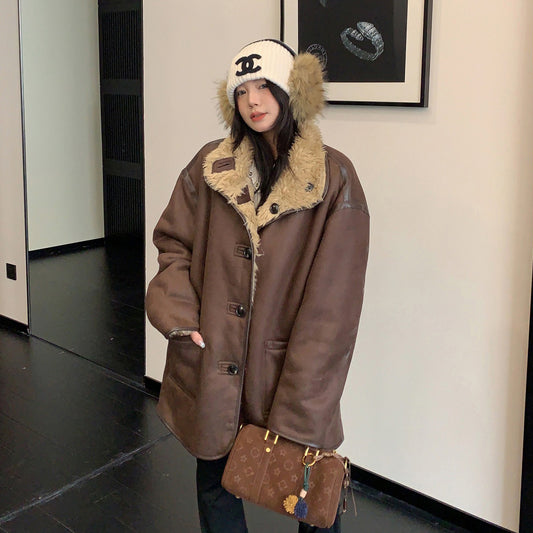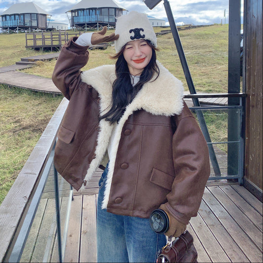 【アウター】甘め フェイクムートン厚手保温アウター 2025冬 若見え 防風 ハイネック ボアトップス レディース【JZシリーズ】