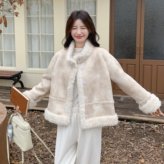 【アウター】冬 レディース 蓮ピンク タイダイ柄 フェイクムートン ボアジャケット ハイネック 小柄向け 韓国風コート【JZシリーズ】