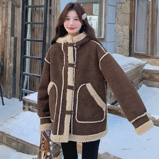 【アウター】キャメルスエード調フード付きフェイクムートンコート 冬 カラー切替 ボア裏地 保温 中綿ジャケット レディース【JZシリーズ】