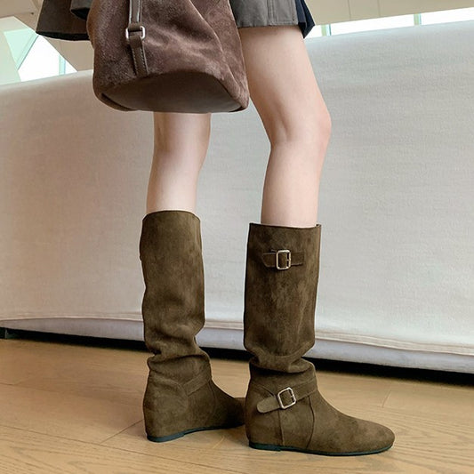 【シューズ】🍂キャラメルブラウン ベルト付きヴィンテージ風ハイカットウエスタンブーツ💫スエードラウンドトゥ レディース