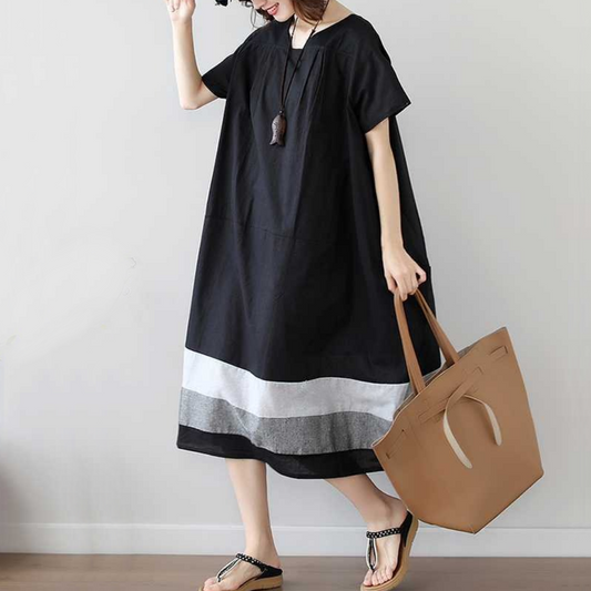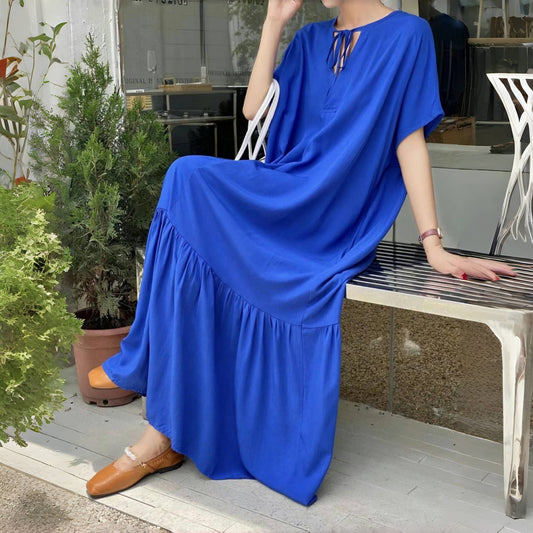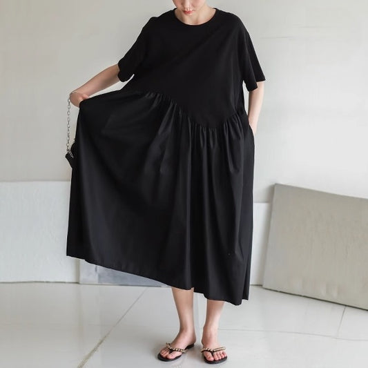 [洋裝] [10-15天內出貨] 夏季寬鬆舒適長款短袖洋裝拼布素色洋裝