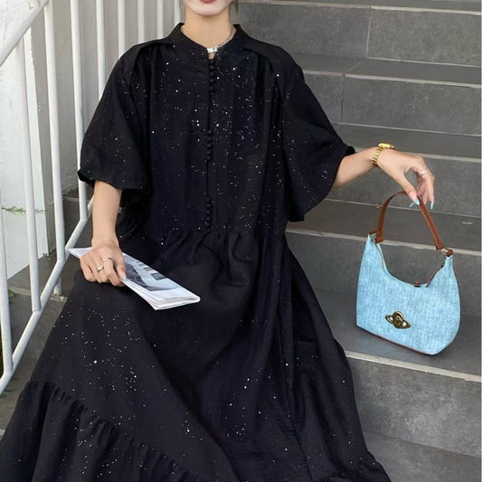 [洋裝] 夏季時尚寬鬆大尺碼修身中袖長款短袖連身裙