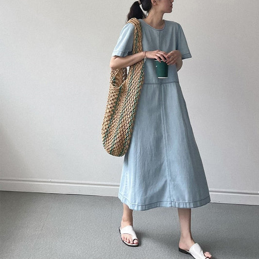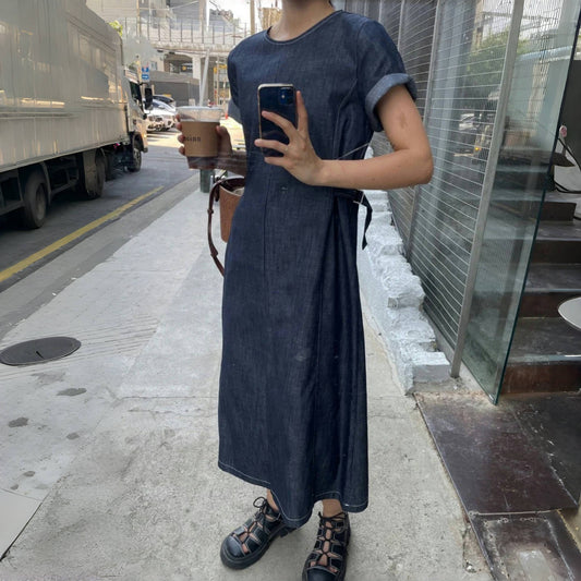 [洋裝] 夏季復古大尺碼天絲牛仔短袖連身裙