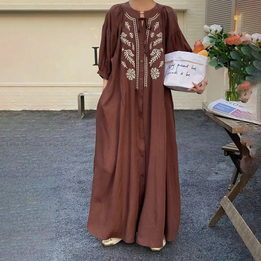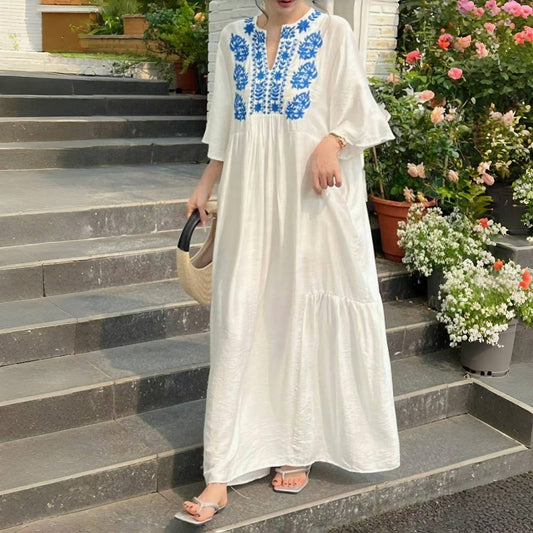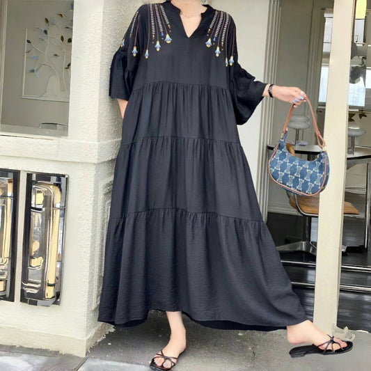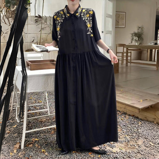 [洋裝] 夏季復古寬鬆大尺碼刺繡短袖連身裙