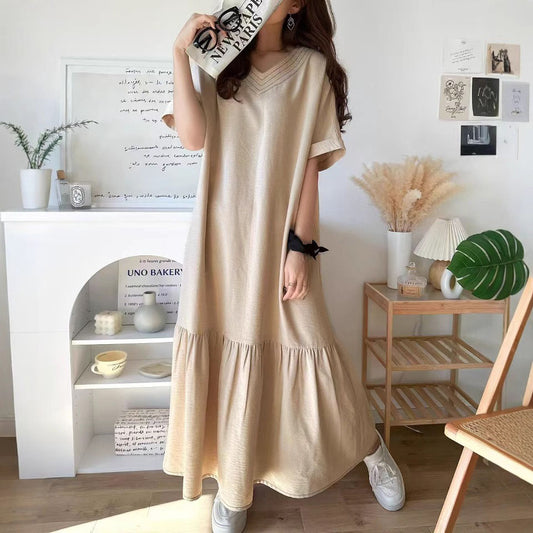 [洋裝] 夏季韓版寬鬆顯瘦V領短袖連身裙