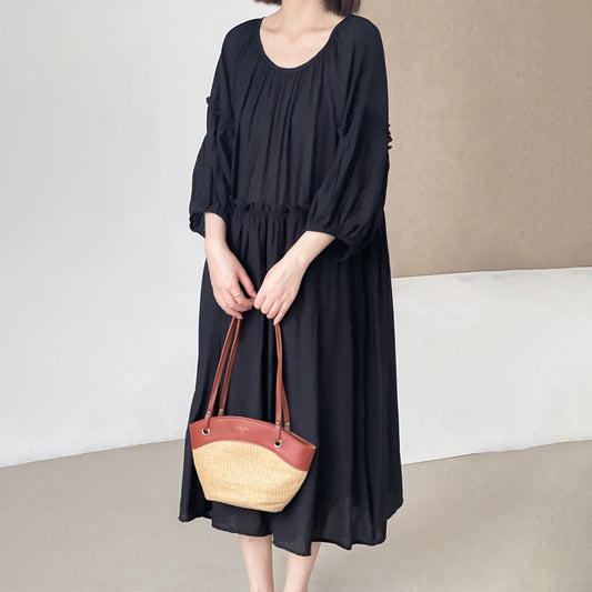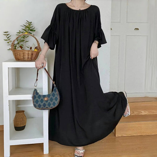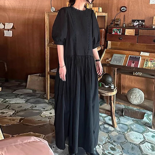 [洋裝] 夏季復古文藝風中長純色寬鬆大尺碼短袖連身裙