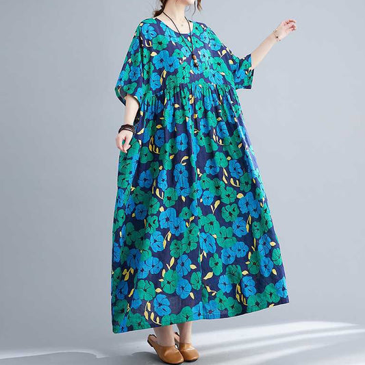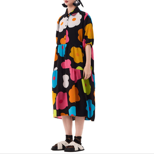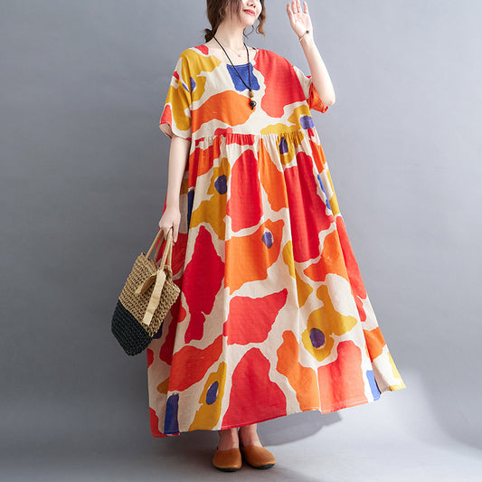 【洋裝】夏季復古大尺碼寬鬆顯瘦過膝長短袖連身裙