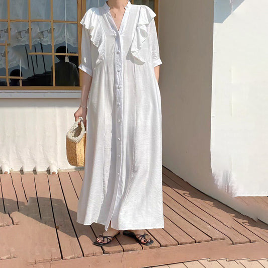[洋裝] 春秋夏荷葉邊下擺單扣寬鬆短袖洋裝長裙