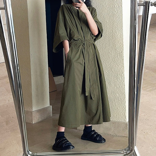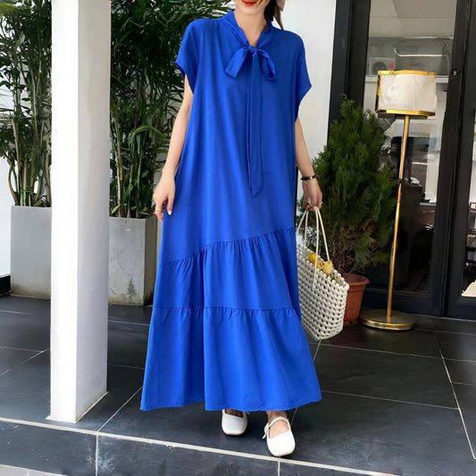 【連身裙】多色可選 夏季立領紐帶寬鬆短袖連身裙