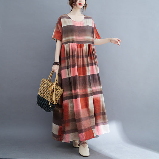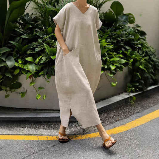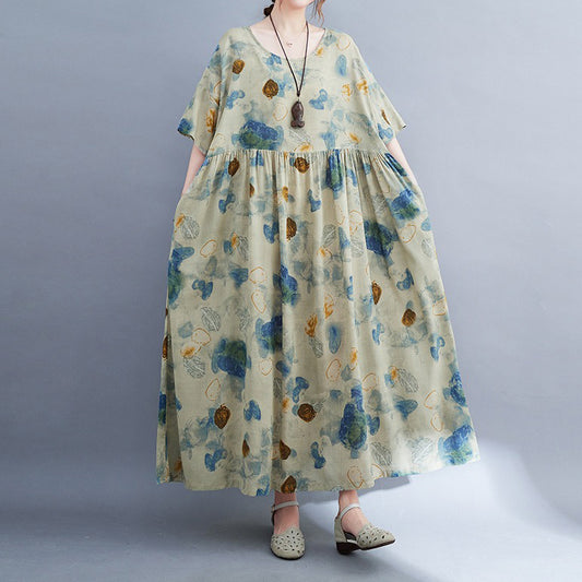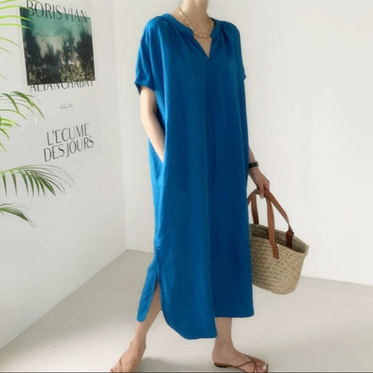 【洋裝】夏季寬鬆舒適棉麻休閒短袖連身裙