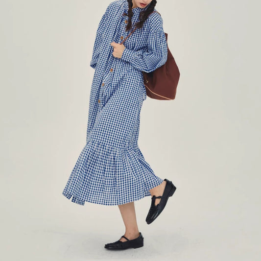 [洋裝] 春秋圓領百褶格紋長袖連身裙