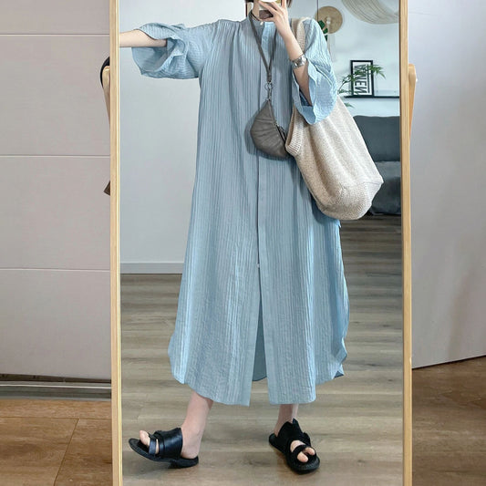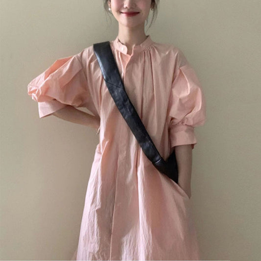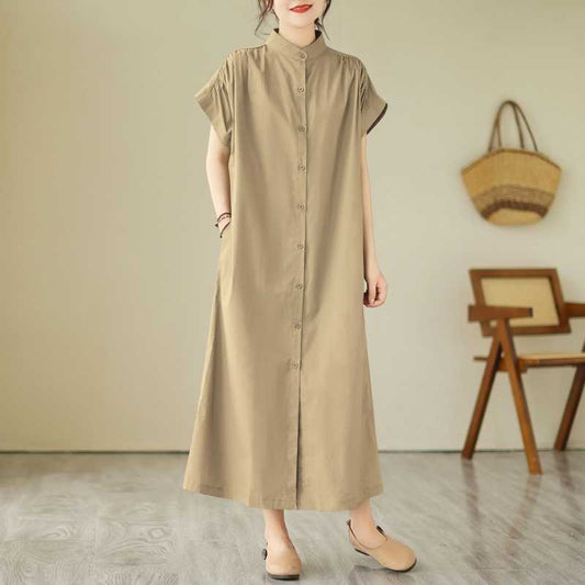 【連身裙】夏季立領寬鬆休閒襯衫短袖連身裙