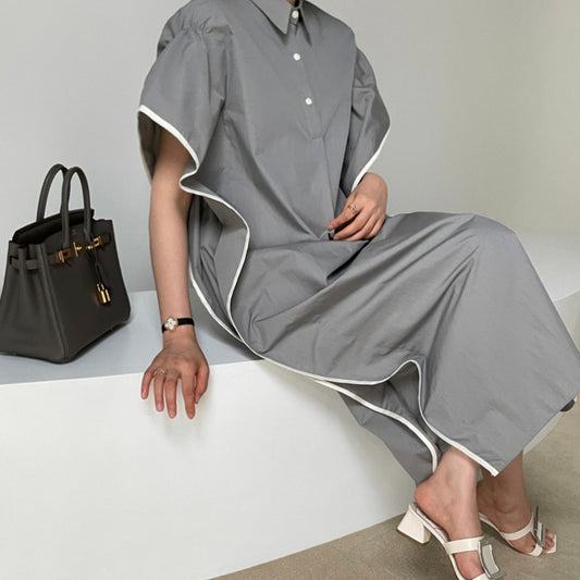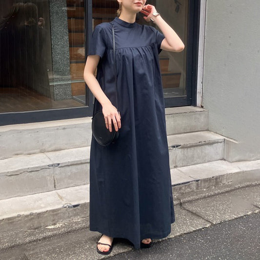 [連身裙] 夏季優雅立領寬鬆短袖連身裙