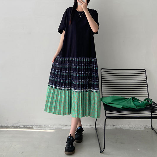 【連身裙】夏季寬鬆拼色韓版顯瘦短袖連身裙