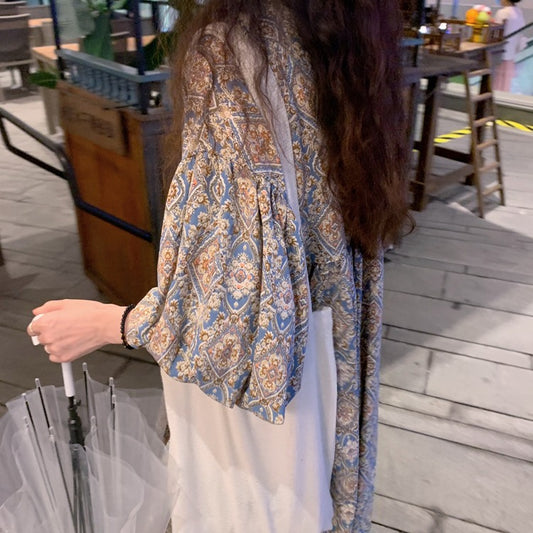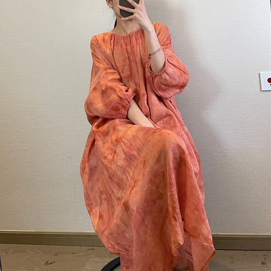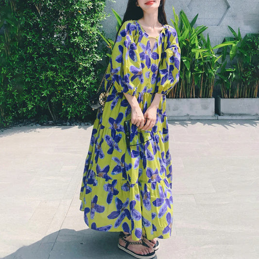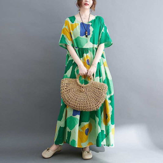 [洋裝] 夏季復古迷離染寬鬆印花燈籠袖短袖連身裙