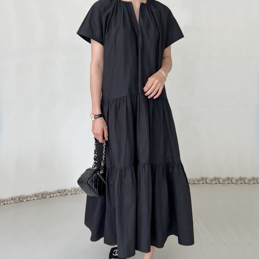 [連身裙] 素色夏換褶泡泡袖連身裙短袖連身裙