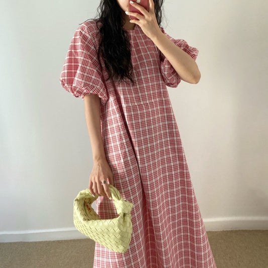 [洋裝] 法式復古格紋休閒泡泡袖夏季短袖連身裙