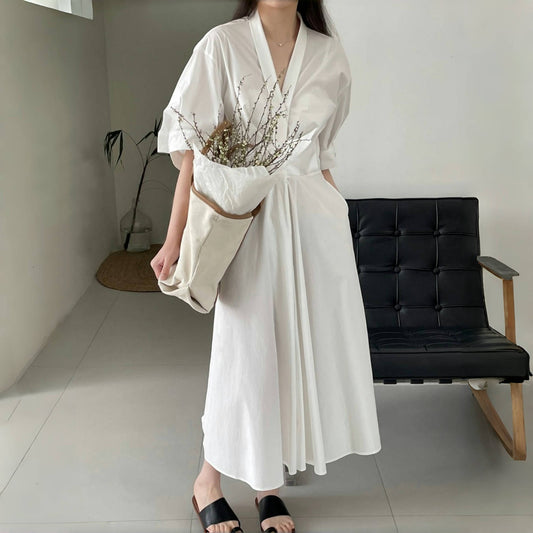 [連身裙] [10-15天內發貨] 復古寬鬆口袋V領素色短袖連身裙