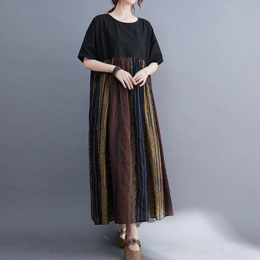 [洋裝] 復古夏日文藝配色大尺碼寬鬆短袖洋裝【SH系列】