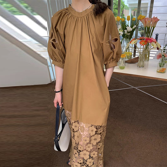 [洋裝] 夏季法式優雅蕾絲寬鬆休閒短袖連身裙