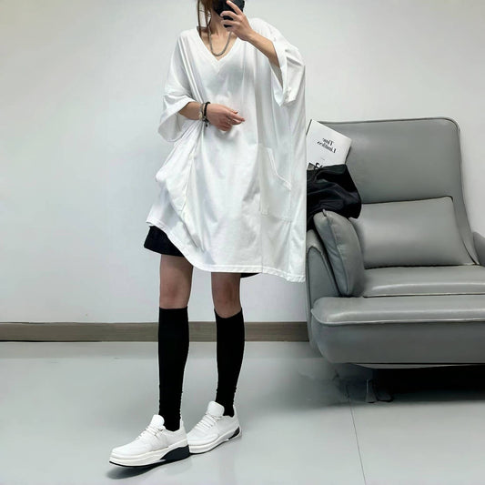 【上衣】超寬鬆夏季修身V領口袋短袖純色T卹