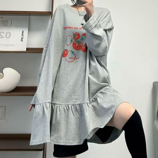【トップス】ゆったり 丸首 長袖 Tシャツ コットン トマトプリント 切替【JZシリーズ】