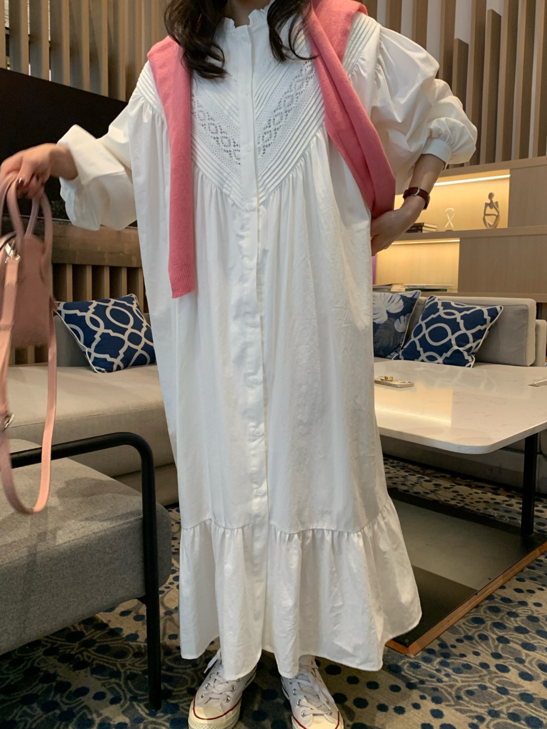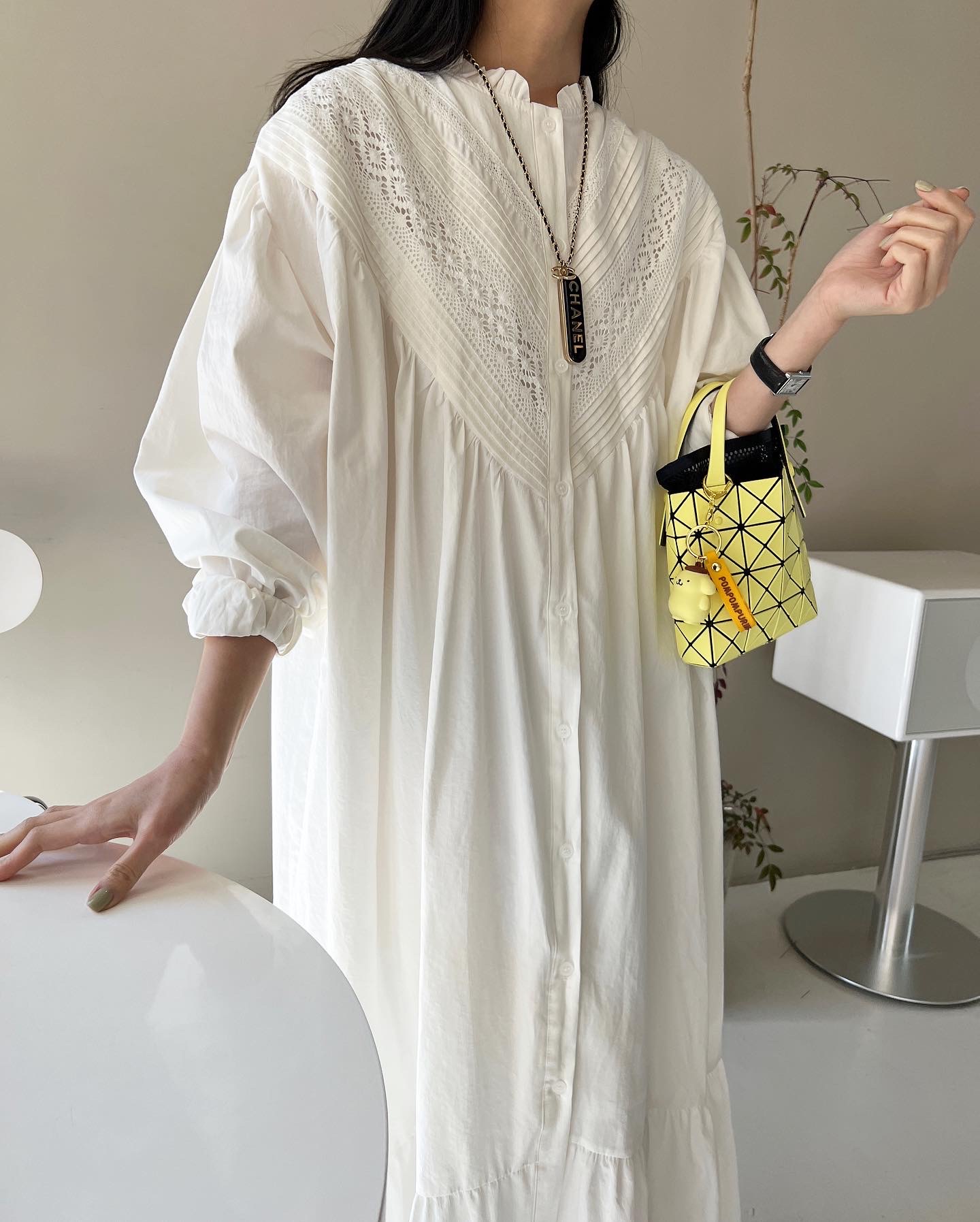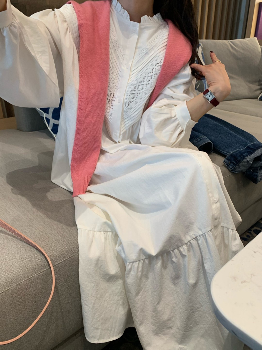[洋裝] 春秋夏韓版復古立領蕾絲純色長袖連身裙