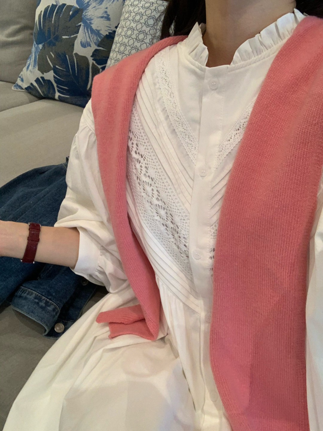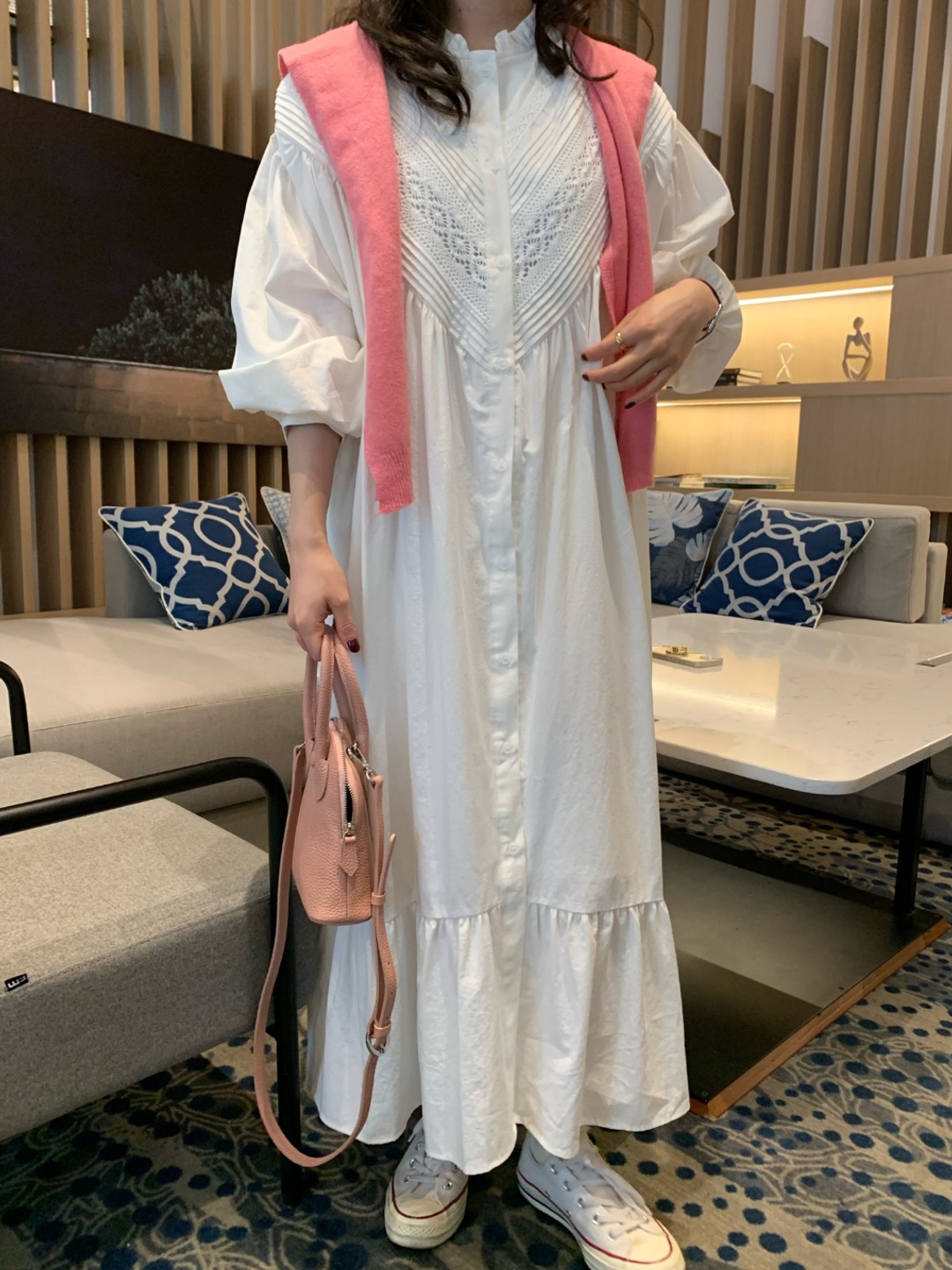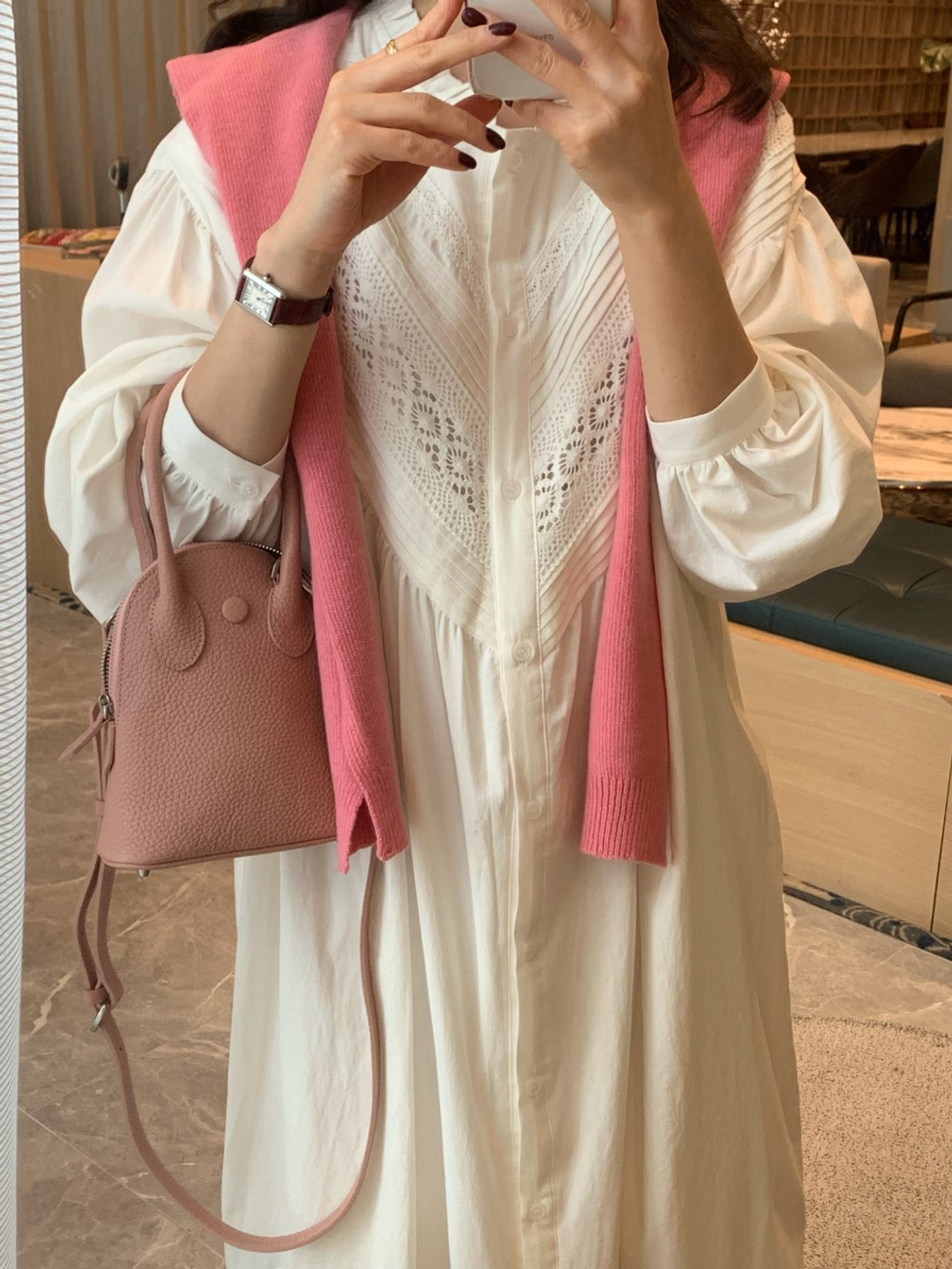 [洋裝] 春秋夏韓版復古立領蕾絲純色長袖連身裙
