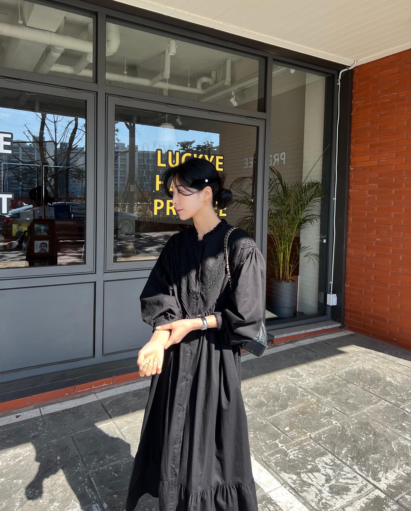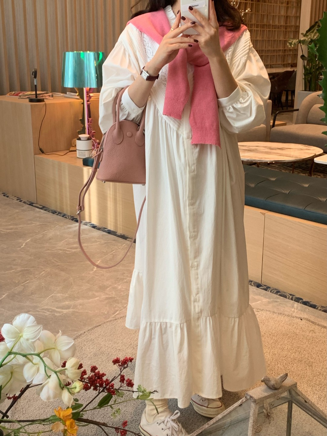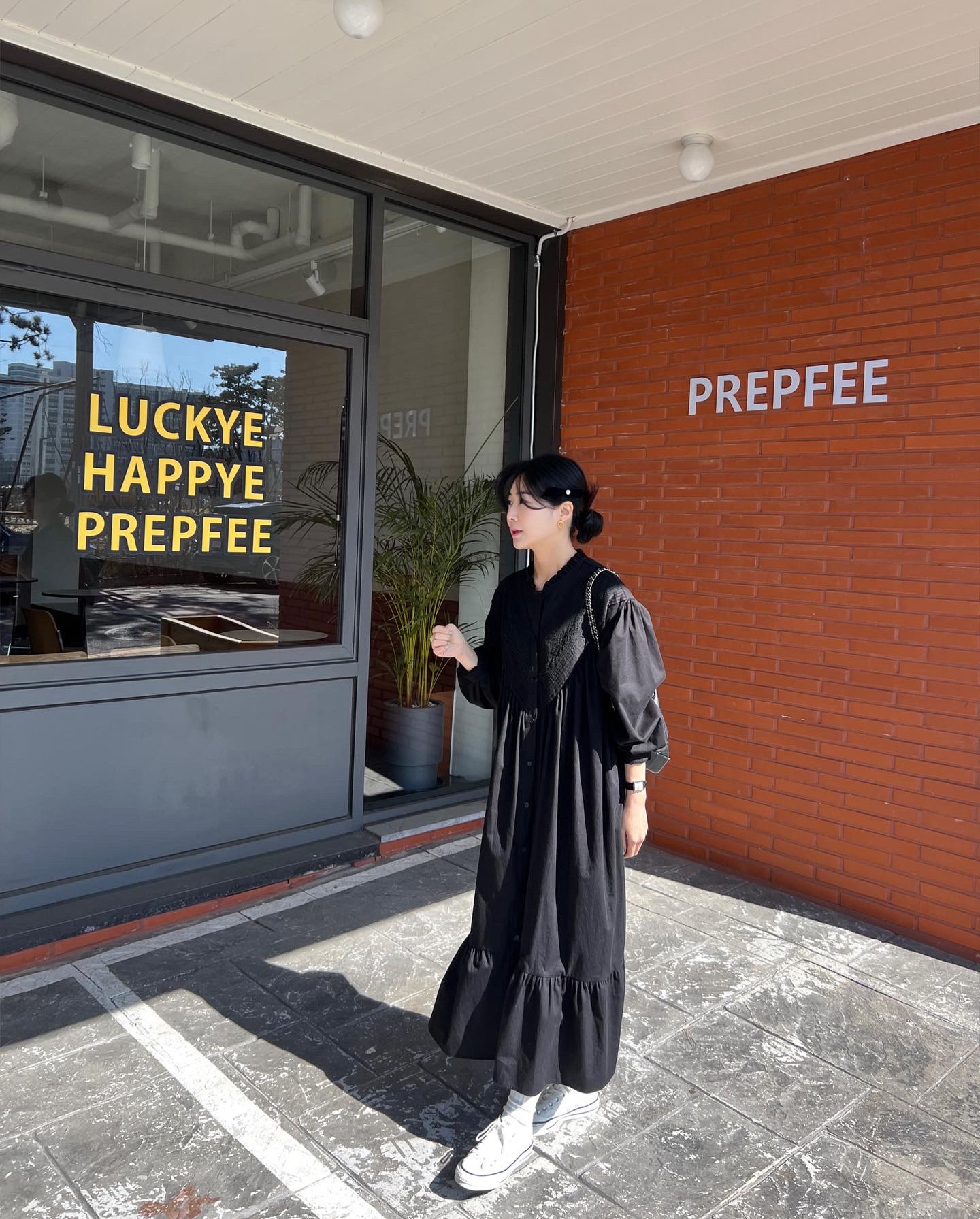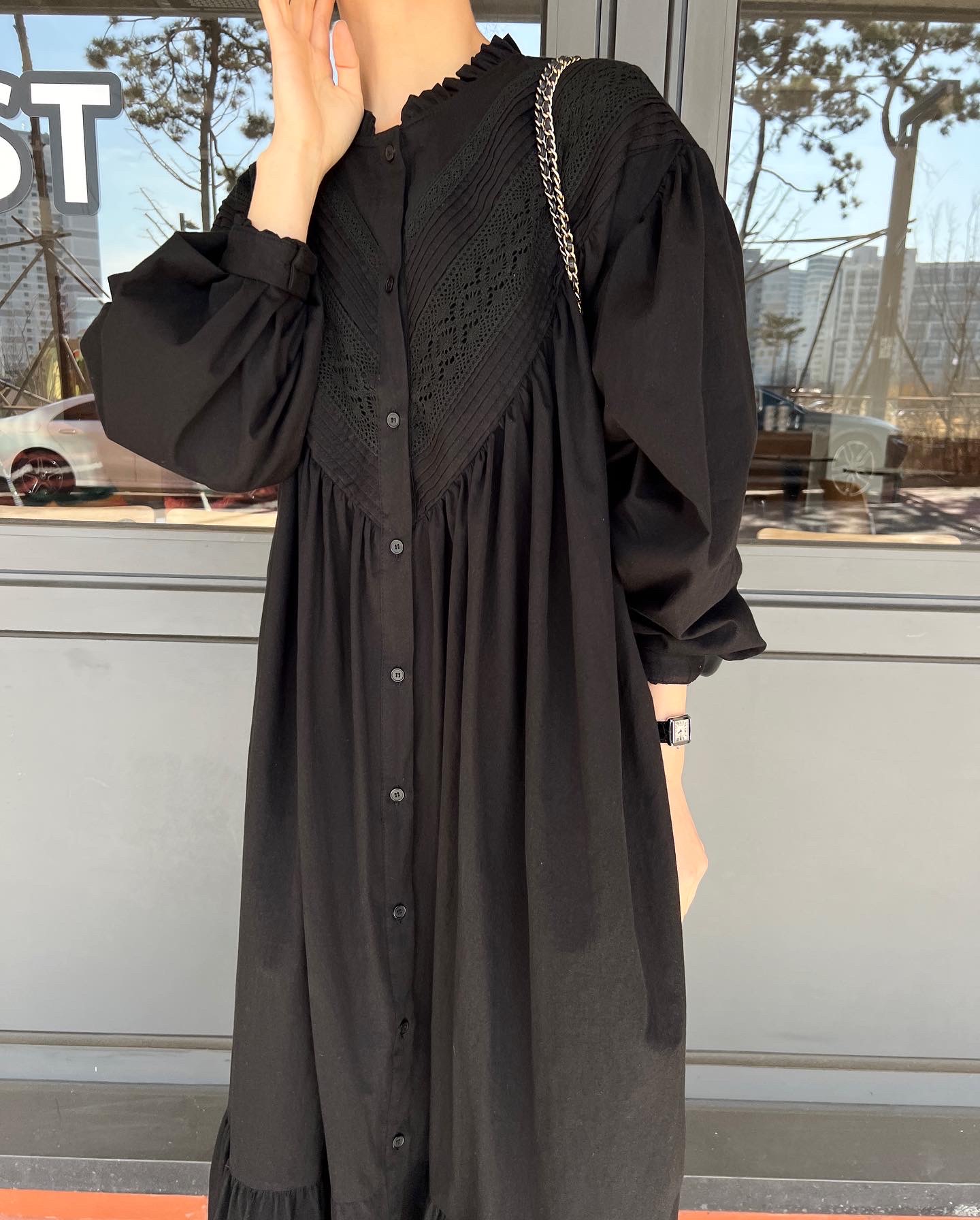 【商品名稱】【連身裙】韓版復古立領蕾絲素色長袖連身裙