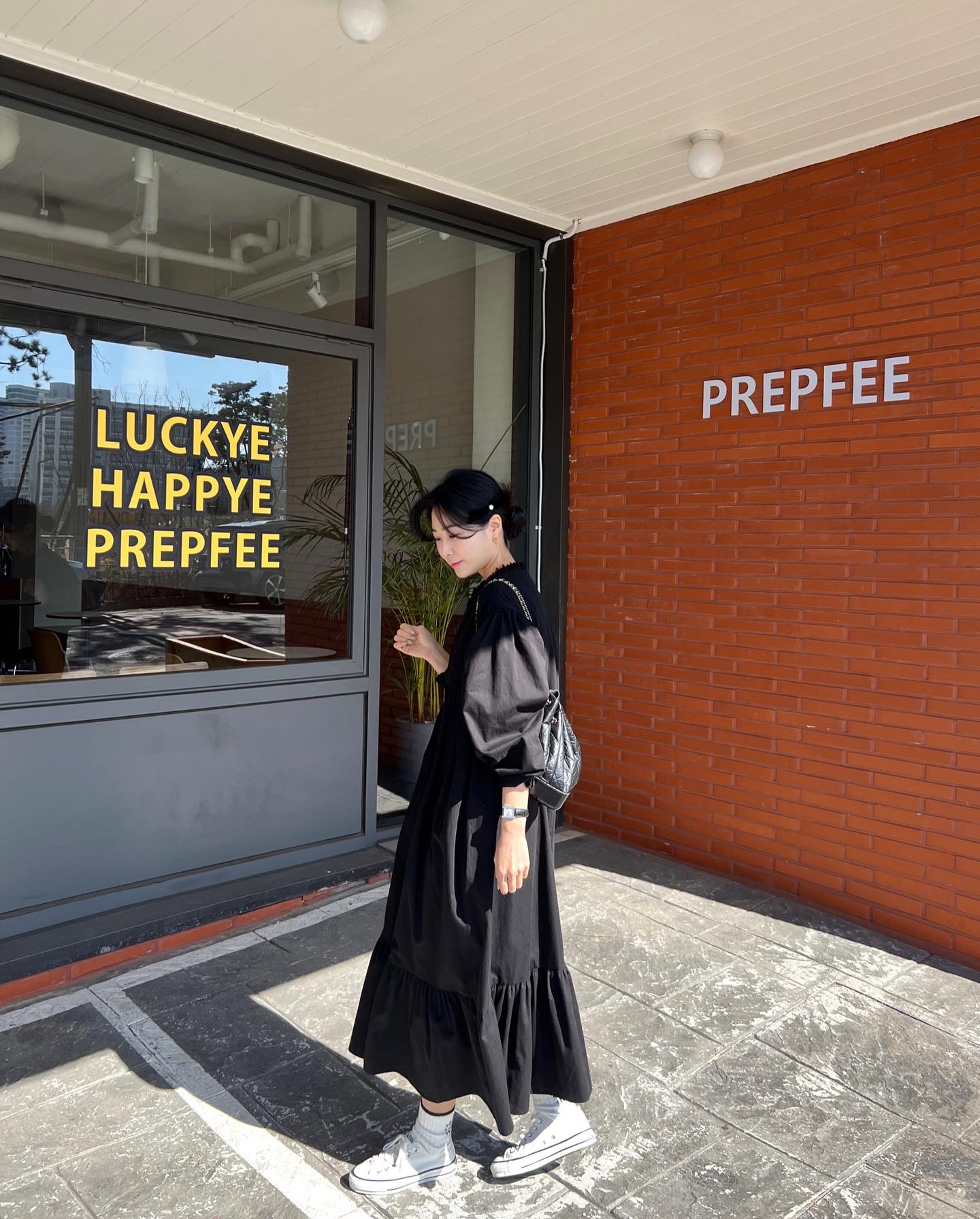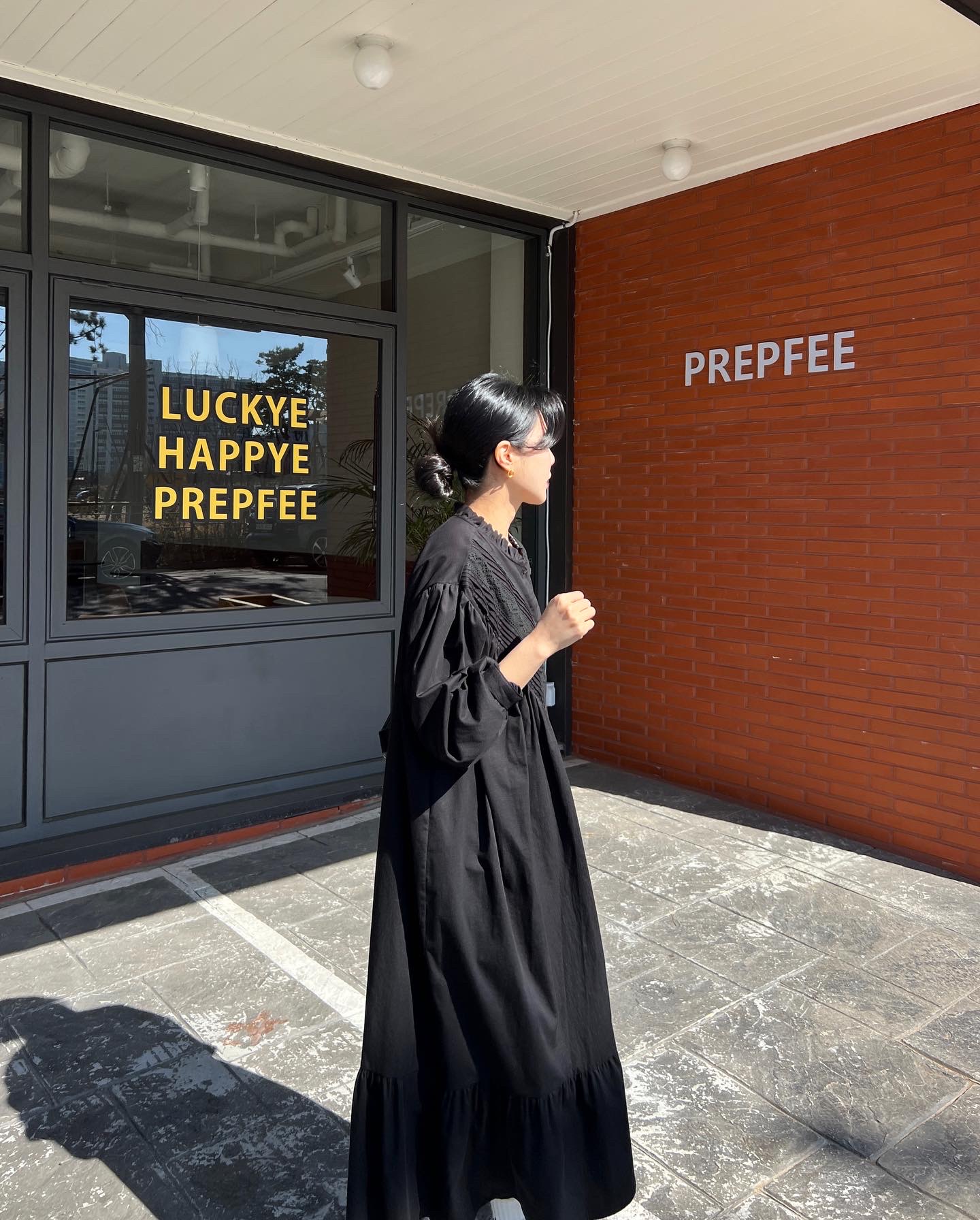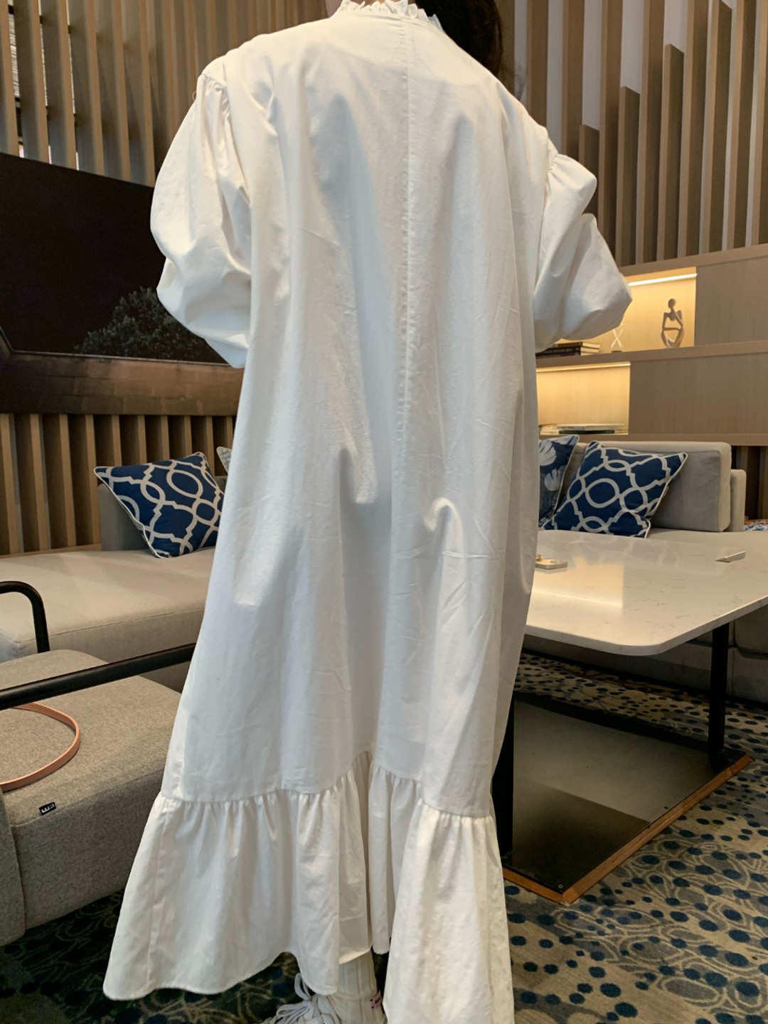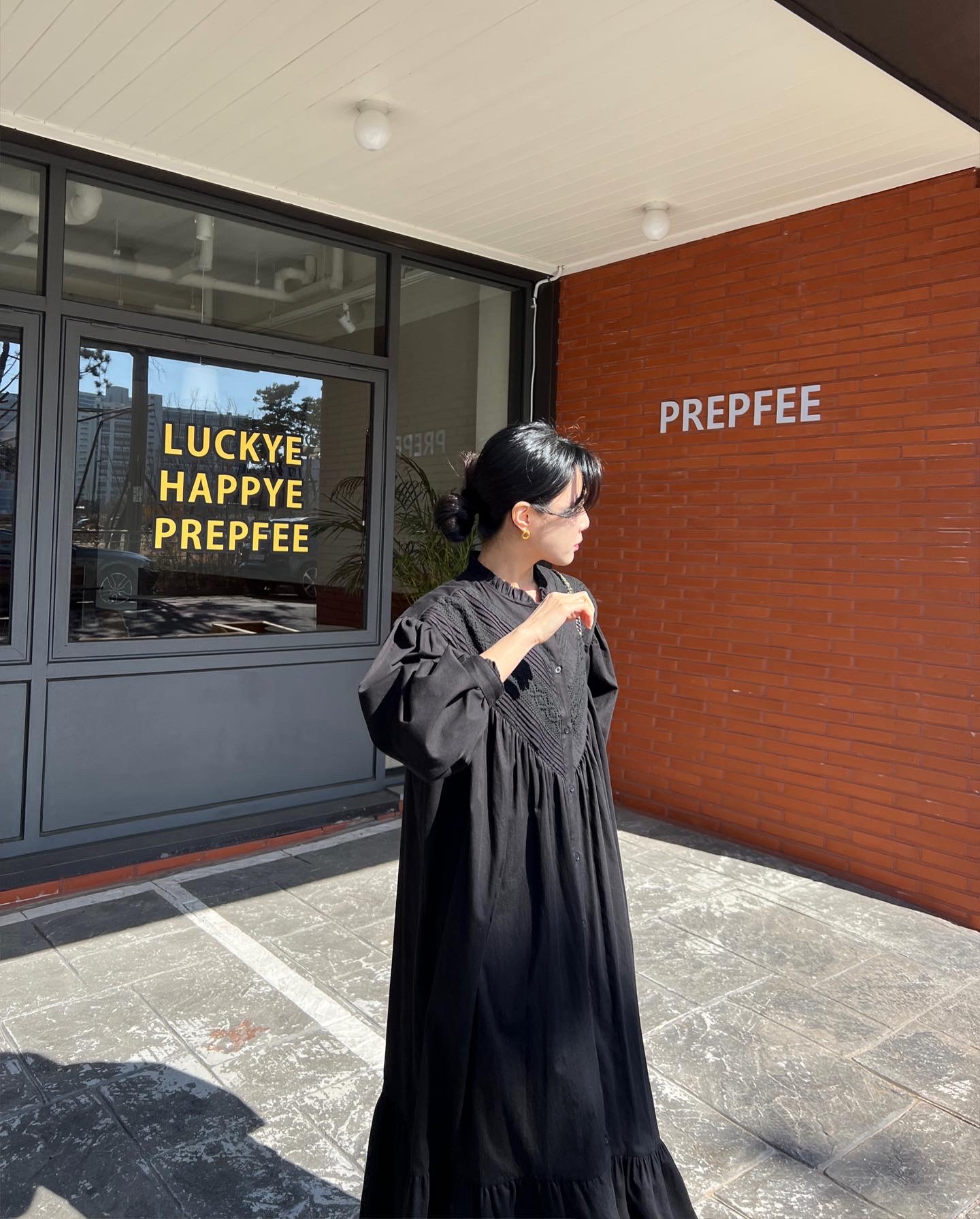【商品名稱】【連身裙】韓版復古立領蕾絲素色長袖連身裙