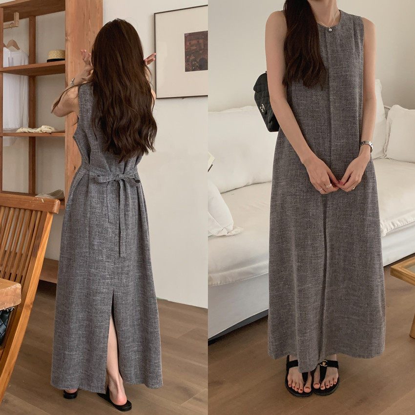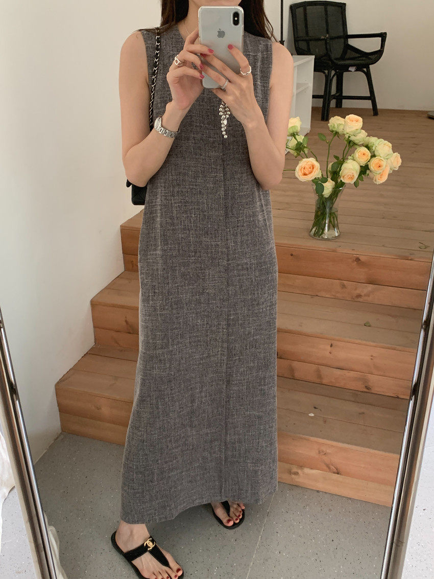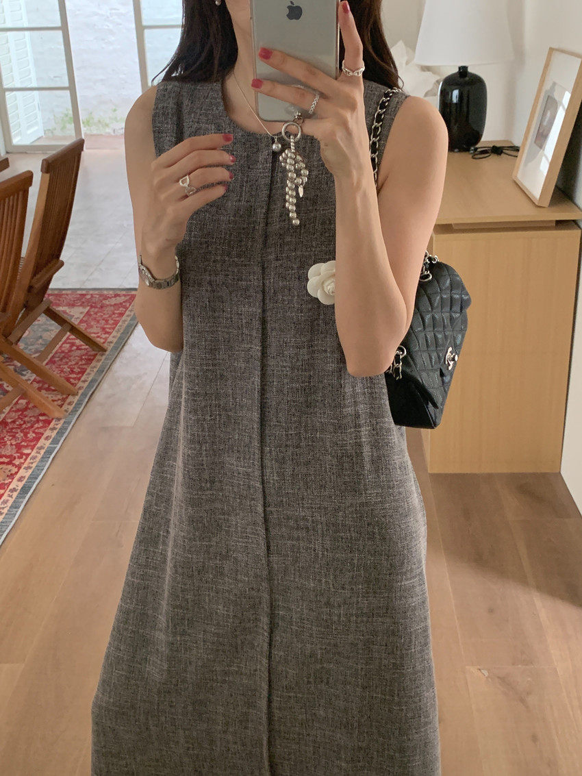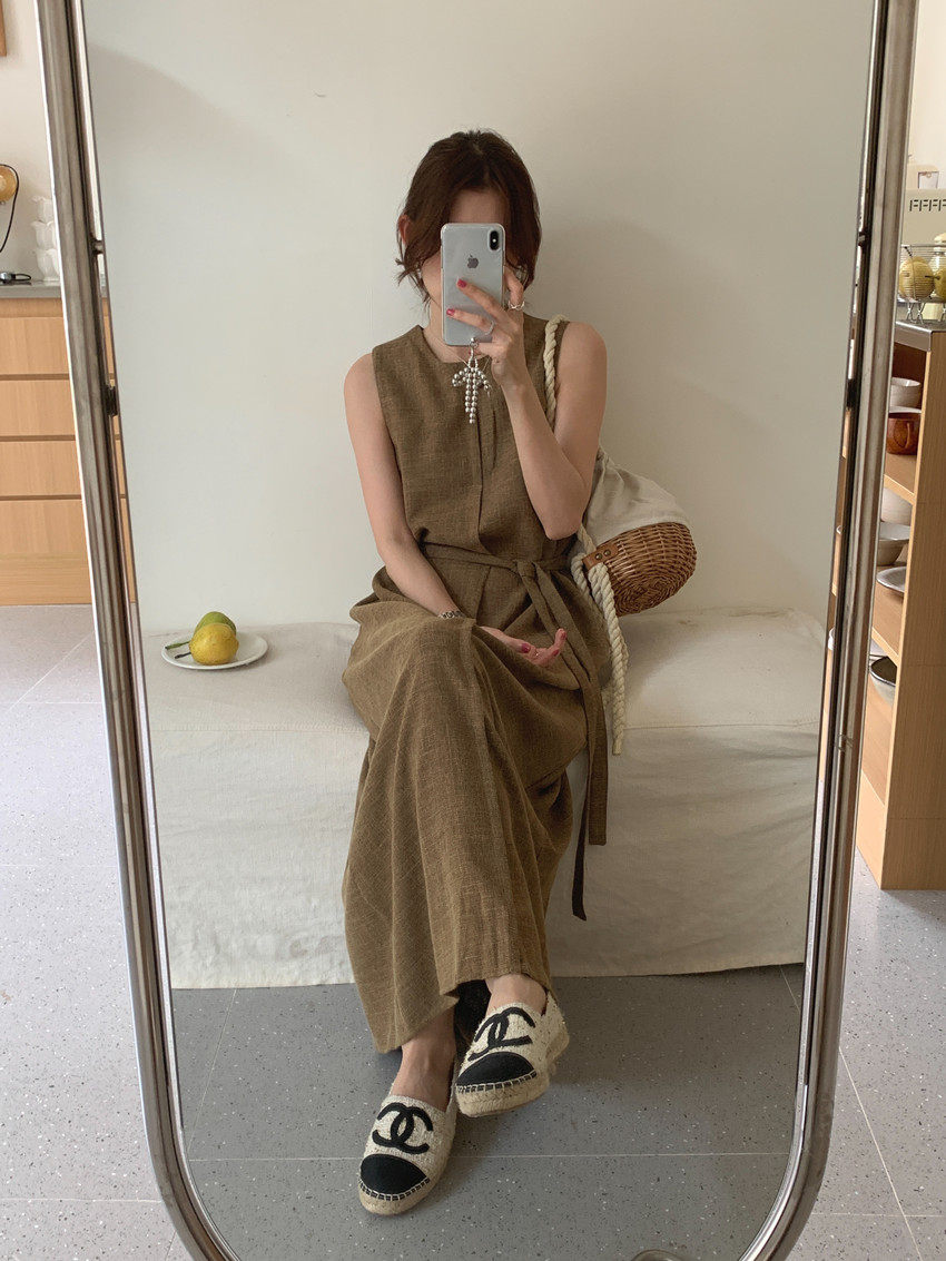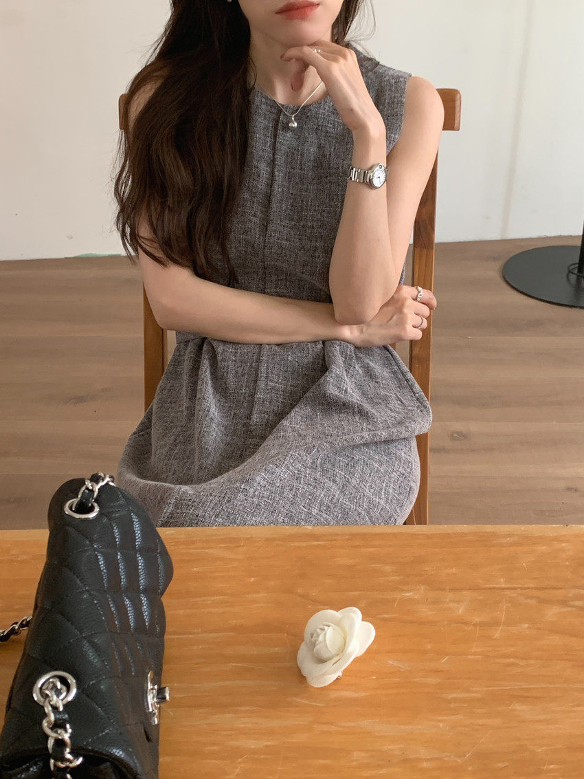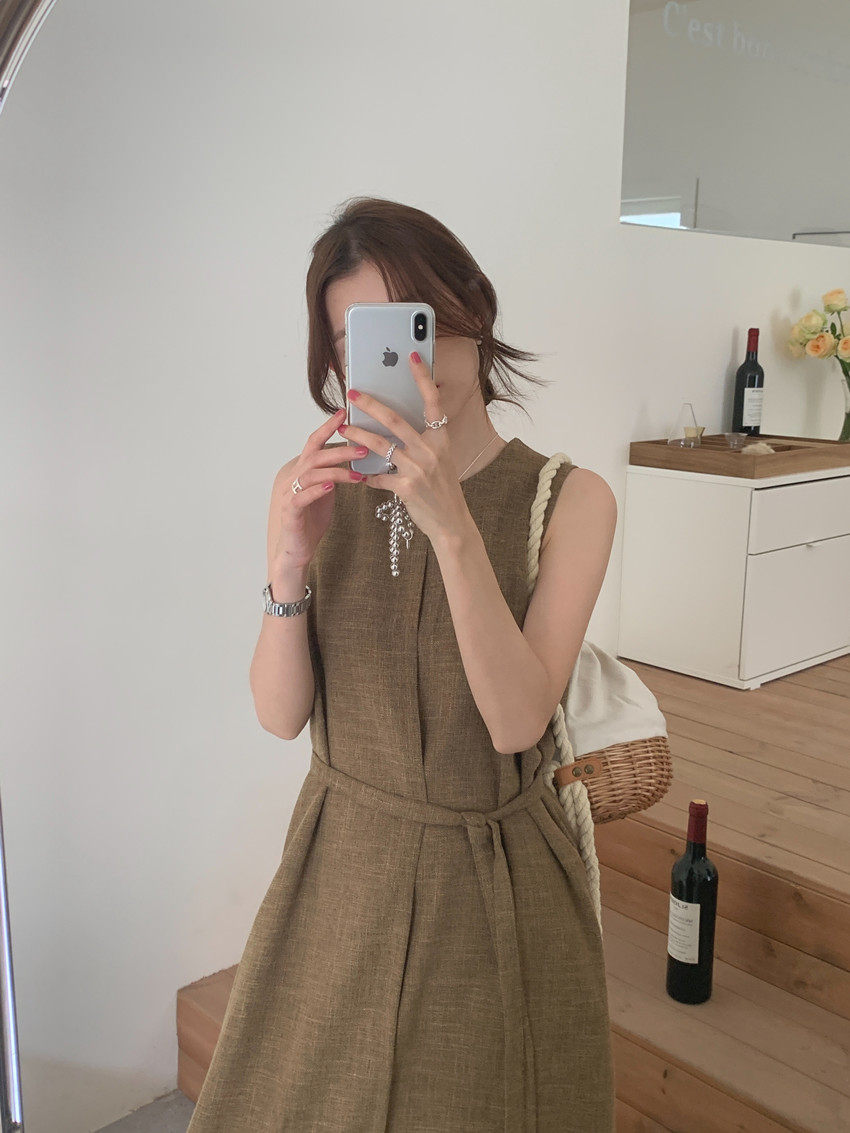 【商品名稱】【連身裙】復古圓領顯瘦無袖連身裙