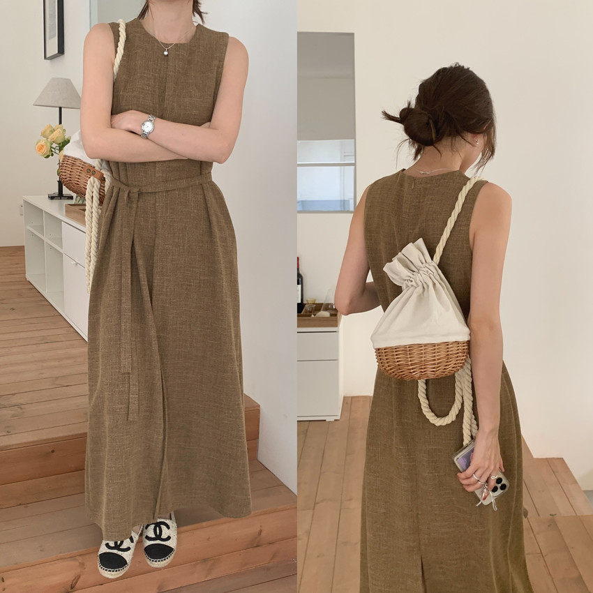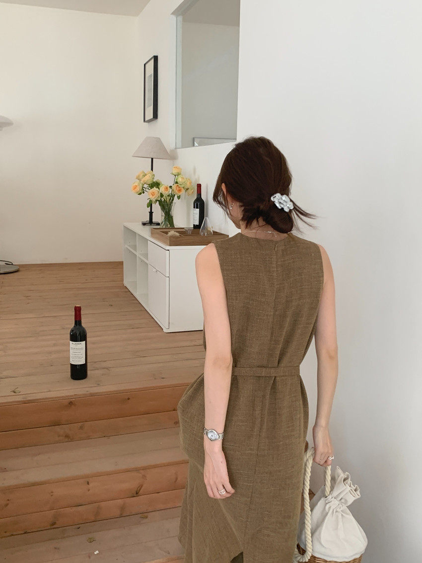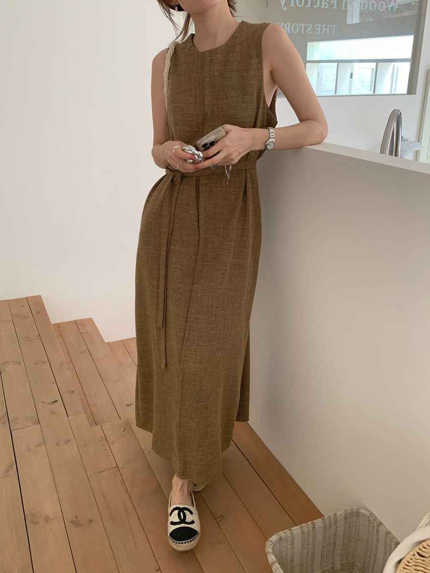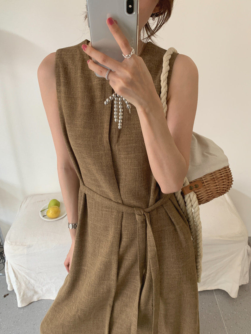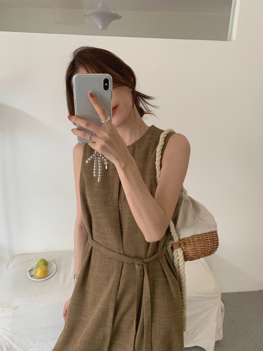 【商品名稱】【連身裙】復古圓領顯瘦無袖連身裙