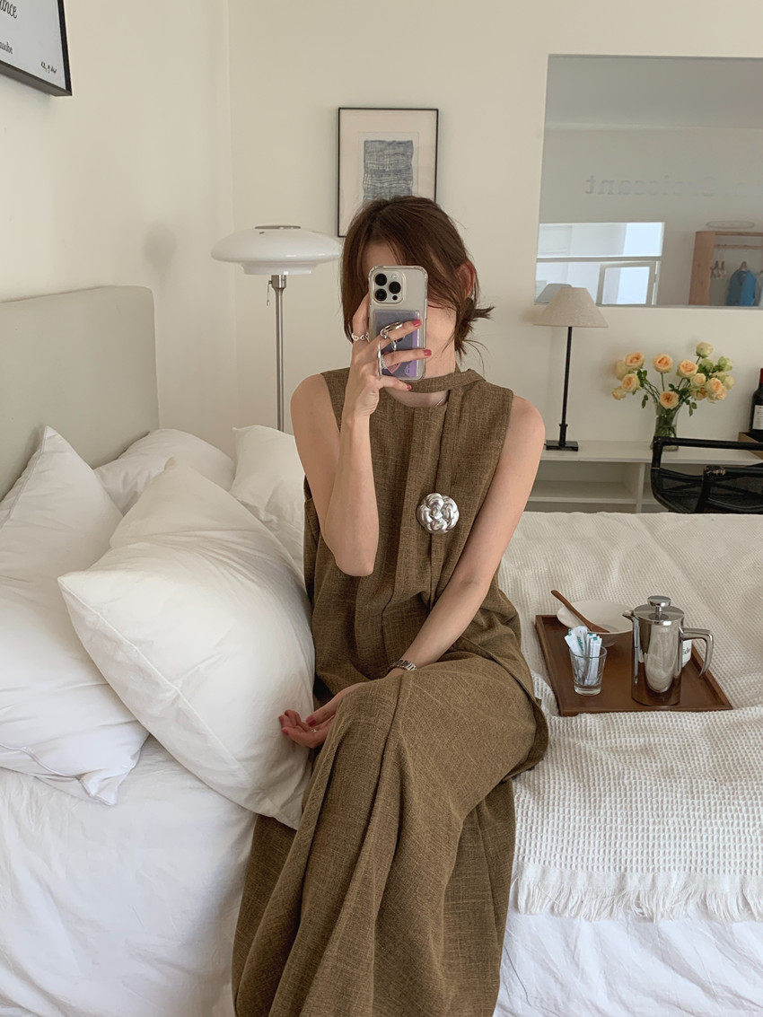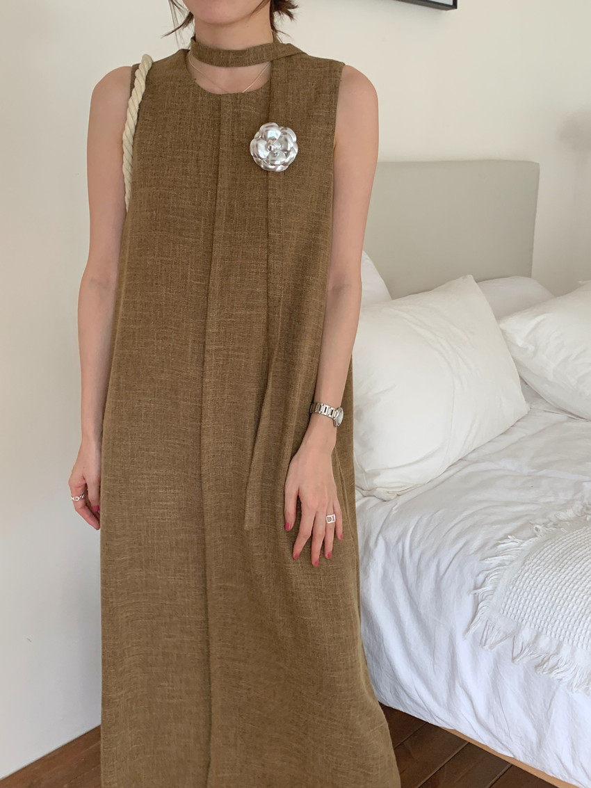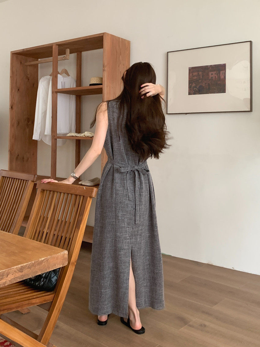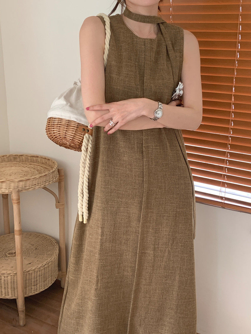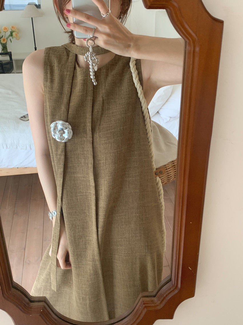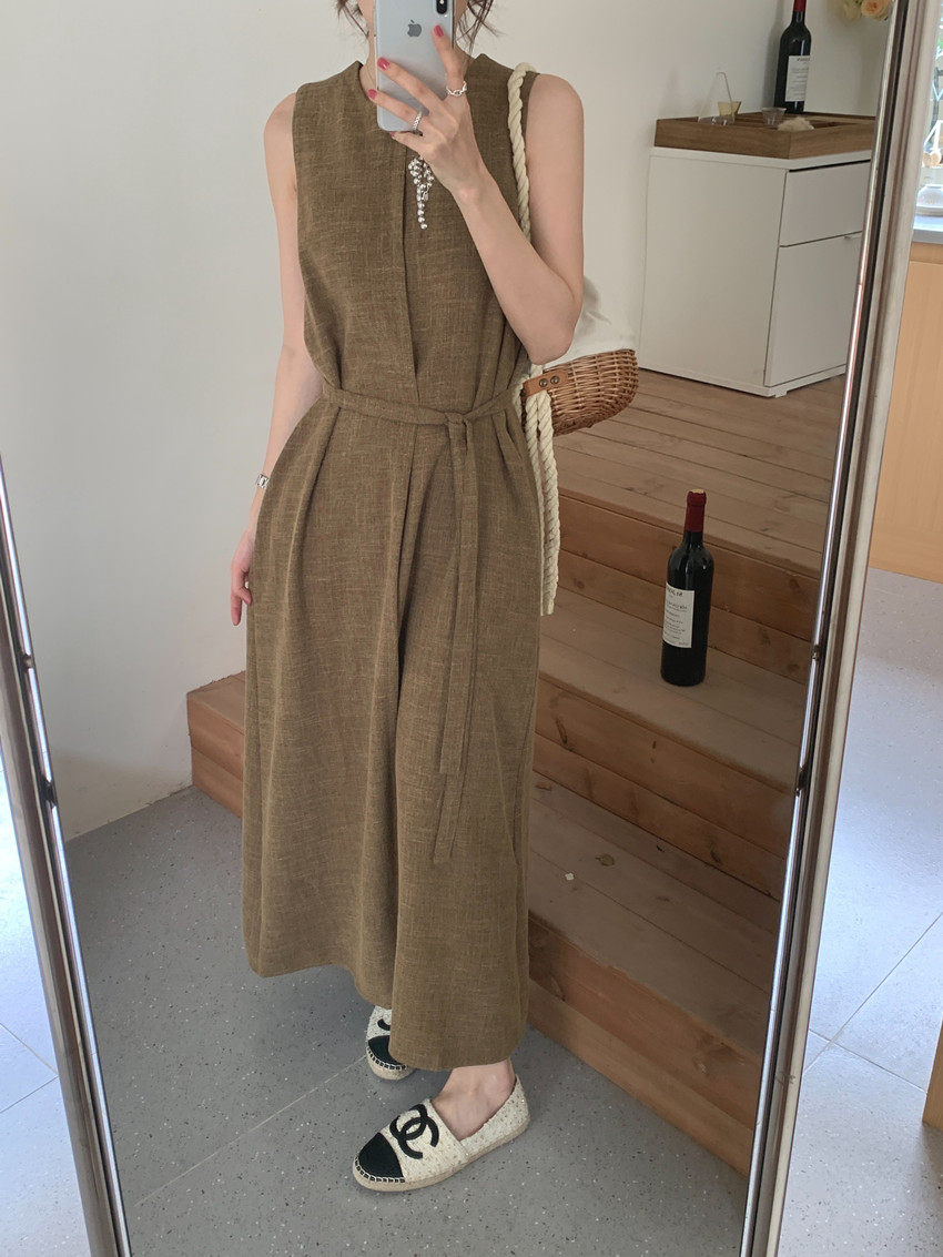 【商品名稱】【連身裙】復古圓領顯瘦無袖連身裙