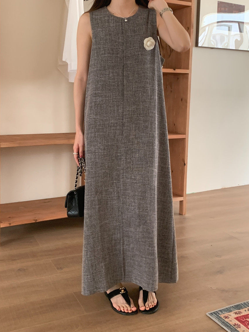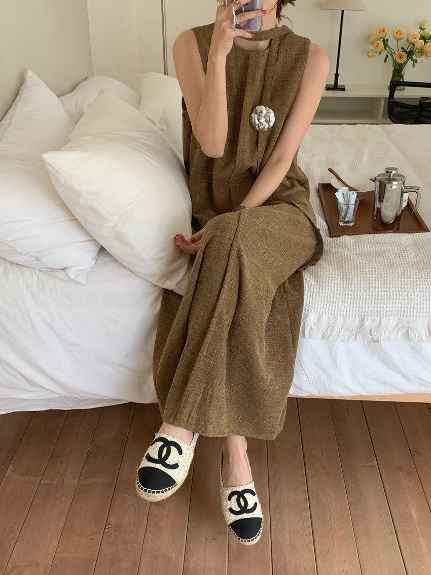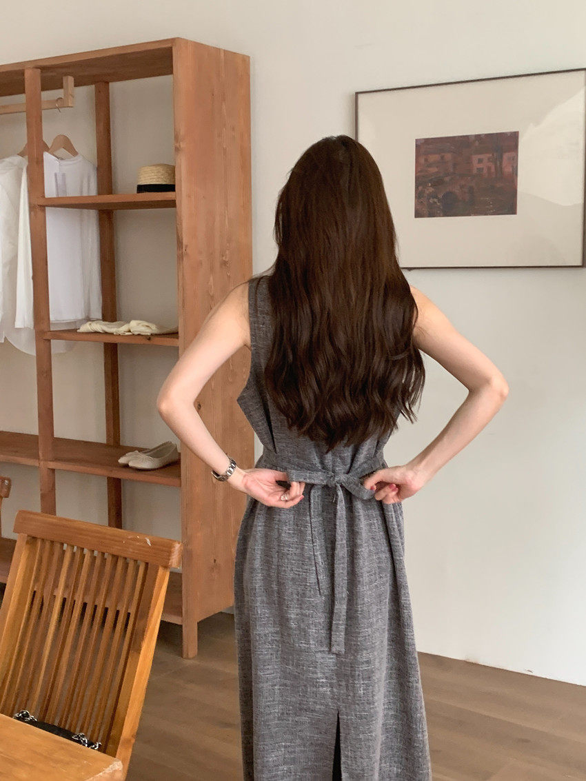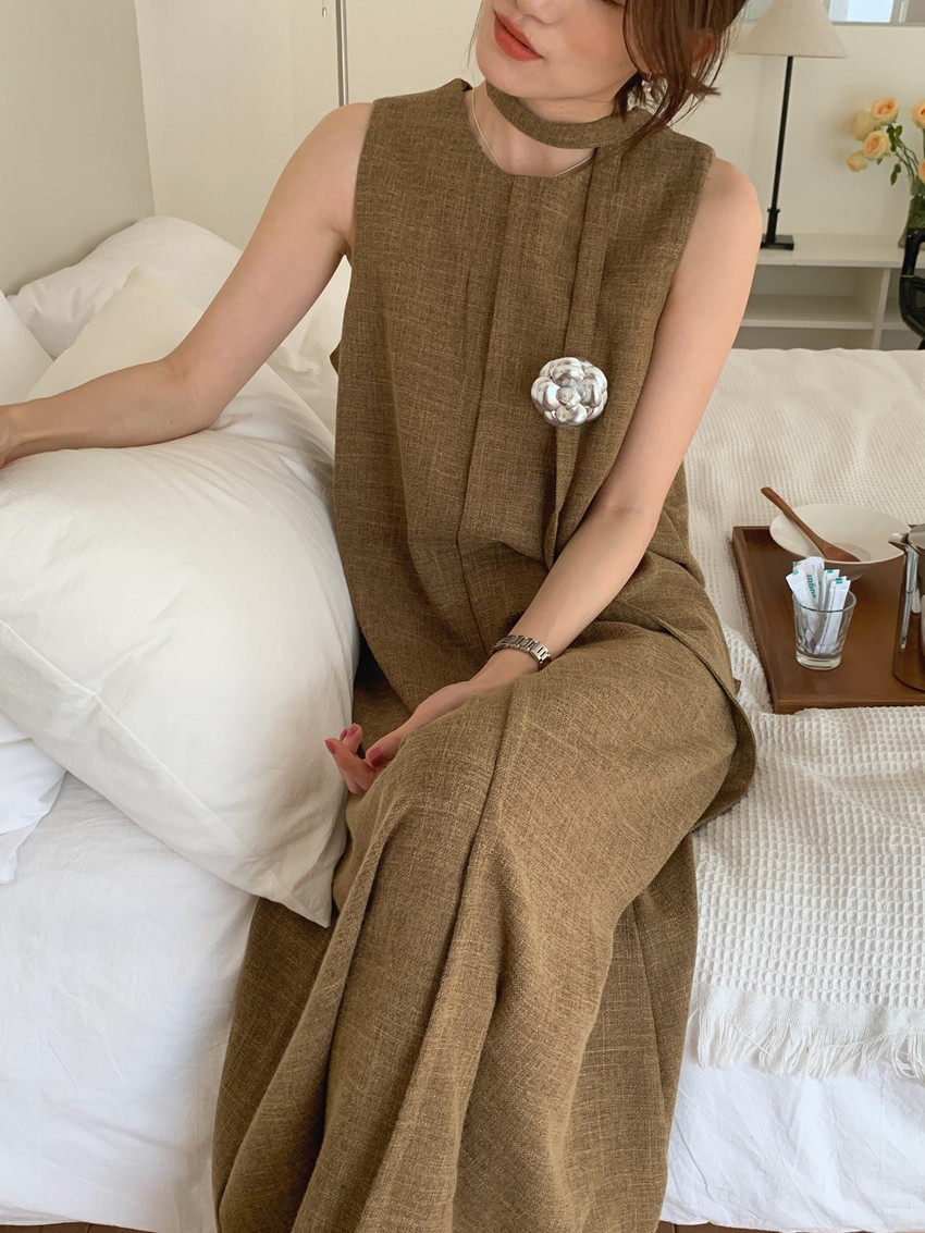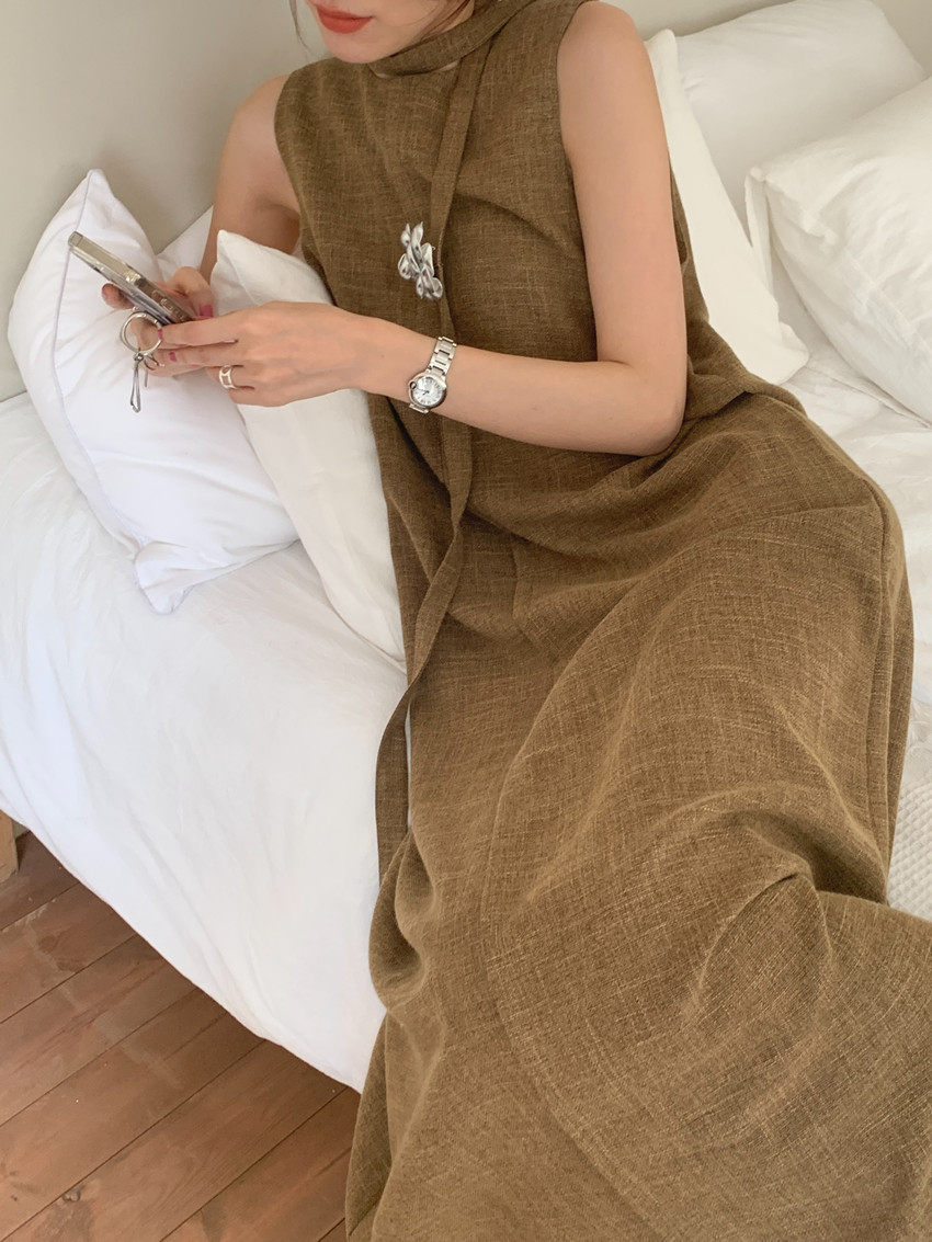【商品名稱】【連身裙】復古圓領顯瘦無袖連身裙