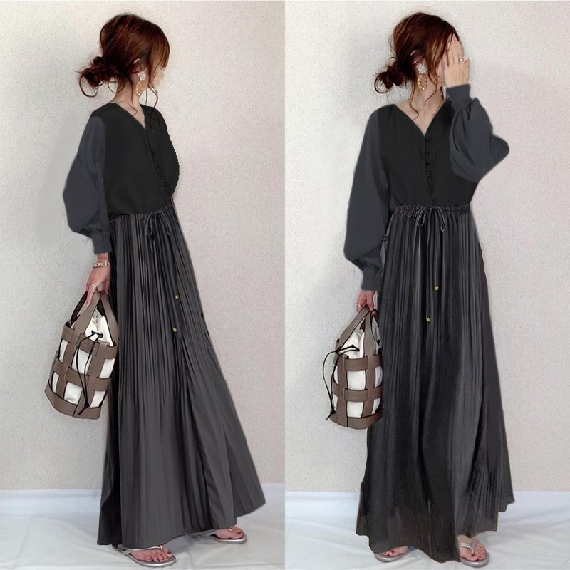 [商品名稱] [洋裝] 秋季V領百褶長袖洋裝