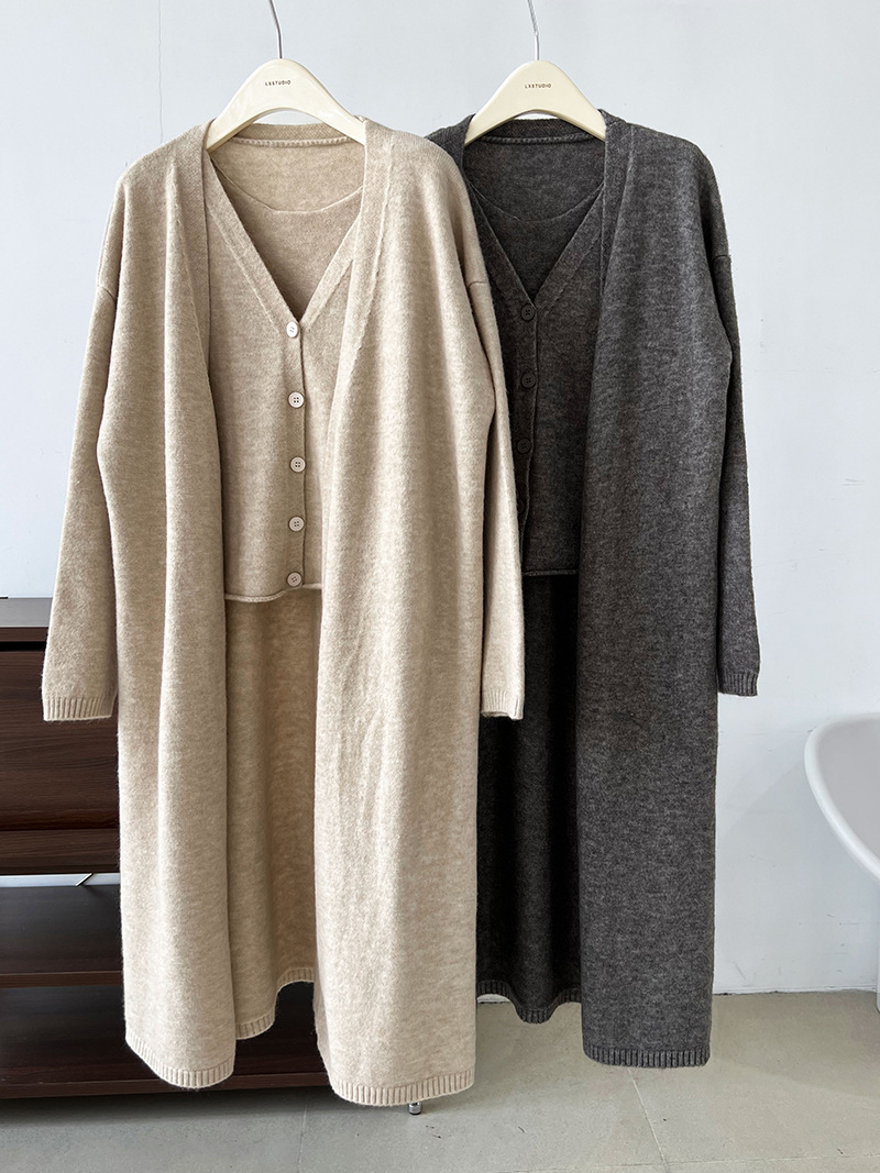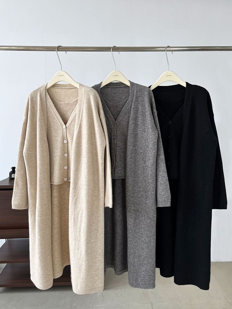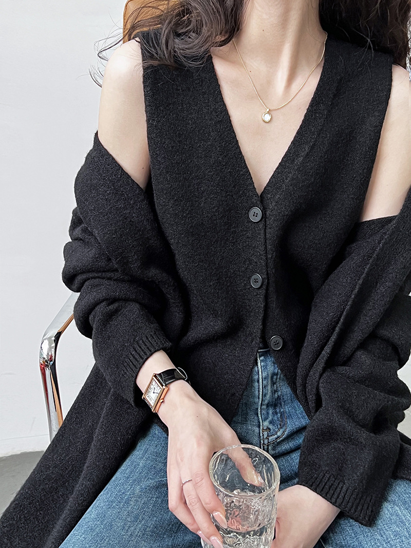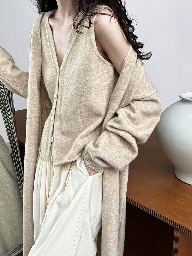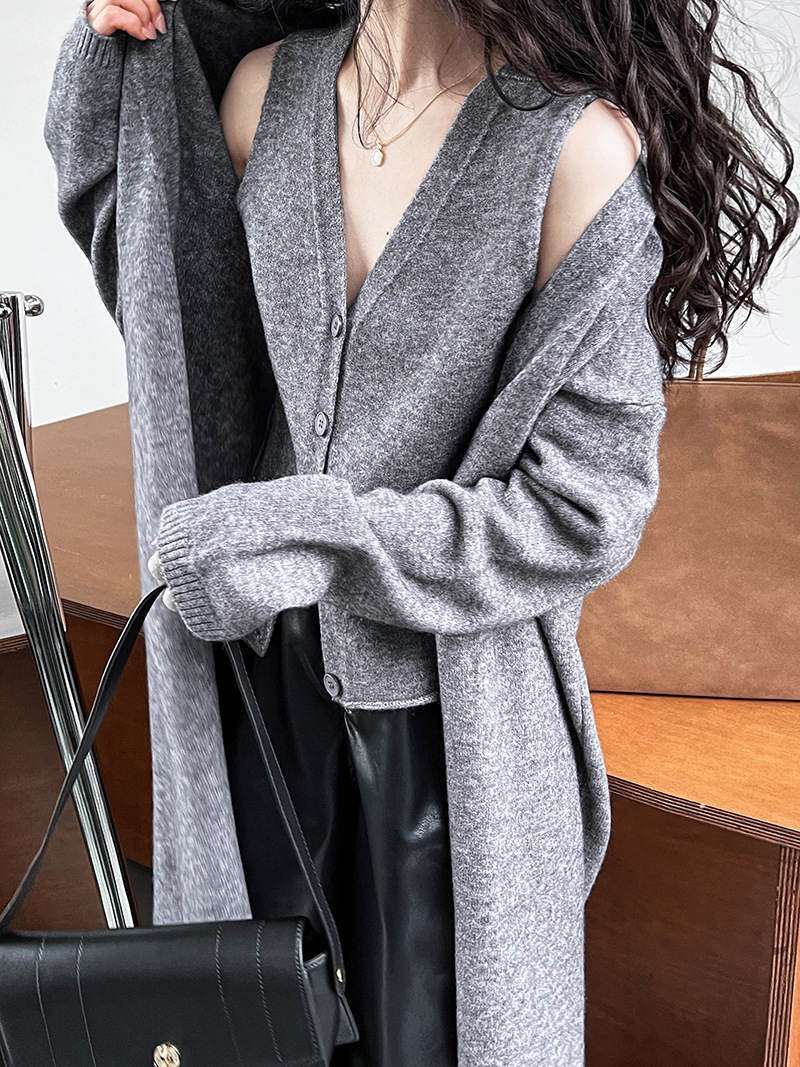 [商品名稱] [外套] 簡約中長針織開襟衫+背心2件套